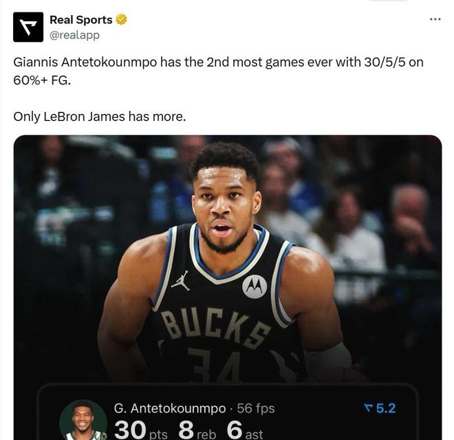 此外,字母哥还创下了NBA历史第2的神迹。数据显示,此役之后,字母哥成为以60%命中率砍下30+5+5场次数历史第二多的球员(143次),仅次于勒布朗·詹姆斯(224次)。